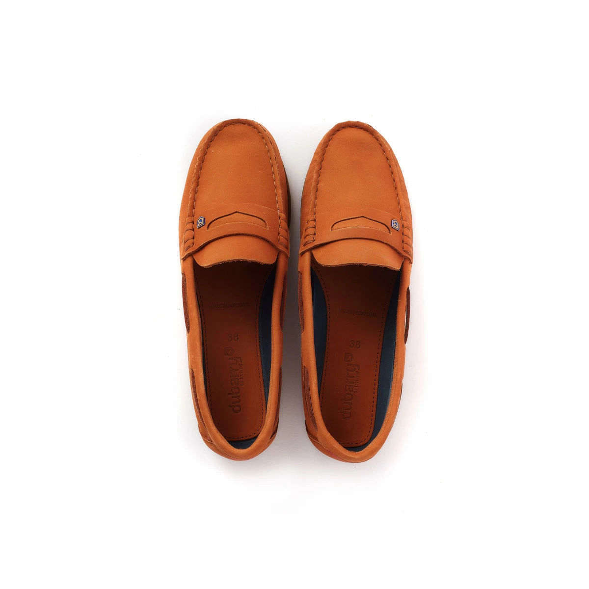 Dieser handgenähte Slip-on in karamellbraun bietet seiner Trägerin an Deck und an Land unvergleichbaren Komfort, bestechende Funktionalität und zurückhaltende Eleganz. Belize spiegelt Dubarrys kontinuierlichen Innovationsdrang in Sachen Design, Form und Funktion wider, der sich hier als klassischer Damenmokassin offenbart. Der aus butterweichem, wasserbeständigem DryFast-DrySoft™-Nubukleder gefertigte Schuh verfügt über die einzigartige NonSlip-NonMarking™-Außensohle, die auch sicher keine Spuren an Deck hinterlässt. Die Innensohle aus Nubukleder bedeckt die EVA-Ganzfußbetteinlage und bietet zusätzlichen Komfort. Handgenähte Mokassinnaht im Kettenstich sorgt dafür, dass Wassertropfen nicht eindringen können. Dezente Backbord- und Steuerbordakzente vervollkommnen Belize.