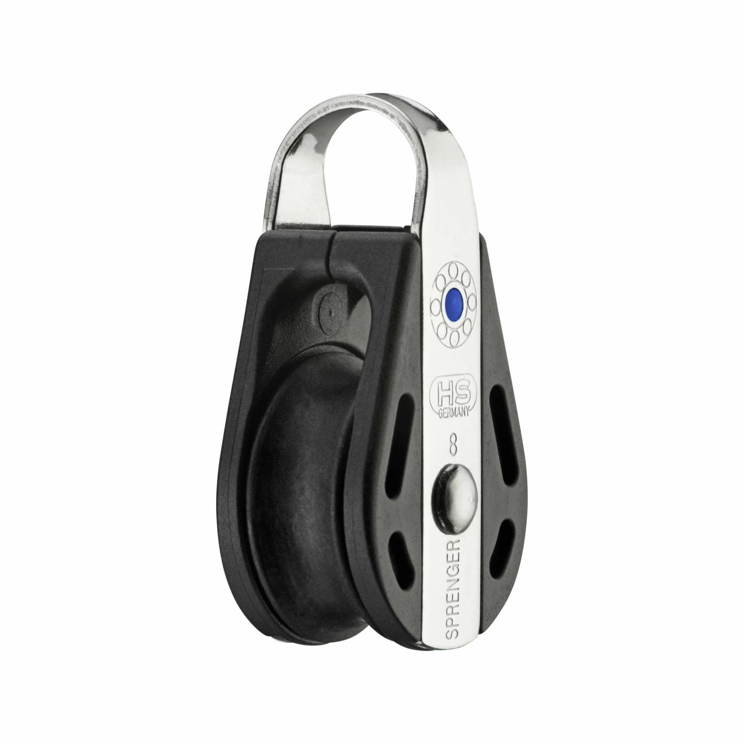 Die komplett neu überarbeitete S-Blockserie von HS Sprenger ist enorm kräftig und durch sein reibungsminimiertes Nadellager aus Edelstahl auch bei hohen Lasten sehr leichtlaufend. Die besonderen Vorteile des Nadellagers von Herm. Sprenger sind das geringe Gewicht, die lange Lebensdauer, sowie die weitgehende Unempfindlichkeit gegenüber äußeren Einflüssen. Durch speziell aus UV-beständigen glasfaserverstärkten geformte Seitenteile des Blocks von Sprenger, ist eine optimale Tauführung gegeben. Der S-Block hat eine formstabile, durchgehende Edelstahllasche, welche mehr Sicherheit und Stabilität garantiert. Durch die spezielle Taumelvernietung des Sprenger-Block werden scharfe Kanten und somit die Beschädigung von Tau verhindert. Der S-Block von Sprenger ist mit einem blauen Punkt gekennzeichnet, welcher für das Nadellager steht. Desweiteren ist an der Verstärkungslasche die Angabe der maximalen Taustärke angegeben.