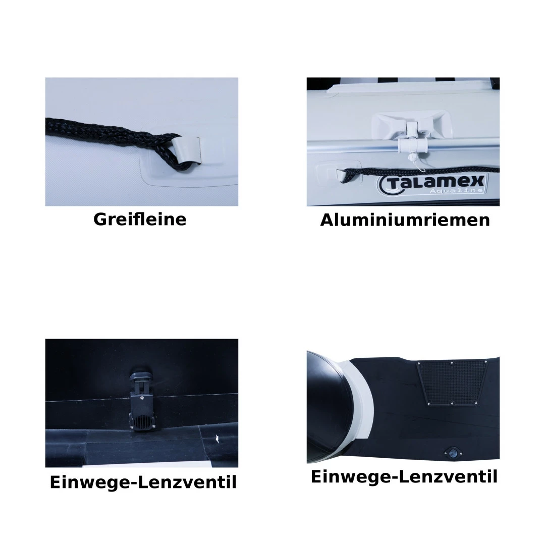 Das Talamex Aqualine QLX350 Schlauchboot hat einen Aluminiumboden, welcher mit einem aufblasbarem Kiel ausgerüstet ist. Der dadurch entstehende tiefe V-Boden stabilisiert das gesamte Schlauchboot wodurch sich hervorragende Fahreigenschaften ergeben. Die Talamex Aqualine Schlauchboote werden aus einem hochwertigen 1100dtex PVC-Gewebe hergestellt, welches besonders langlebig ist. Damit auch am Steg das Schlauchboot nicht beschädigt wird, ist es mit einer Scheuerleiste ausgestattet. Das Beiboot ist bestens als Freizeitboot geeignet.