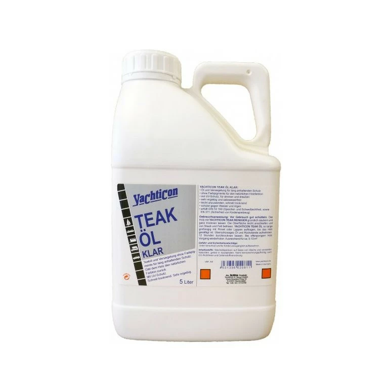 Yachticon Teak Öl Klar versiegelt und schützt Holz über einen langen Zeitraum vor schädlichen Umwelteinflüssen wie Seewasser, Niederschlag oder Sonneneinstrahlung. Das Teak Öl erhält den natürlichen Farbton der Holzflächen. Es ist schnell trocknend, hat keine Pigmentierung und verleiht den zu bearbeitenden Flächen UV-Schutz. Für eine Fläche von 5 bis 10 m² wird ein Liter Yachticon Teak Öl Klar benötigt.